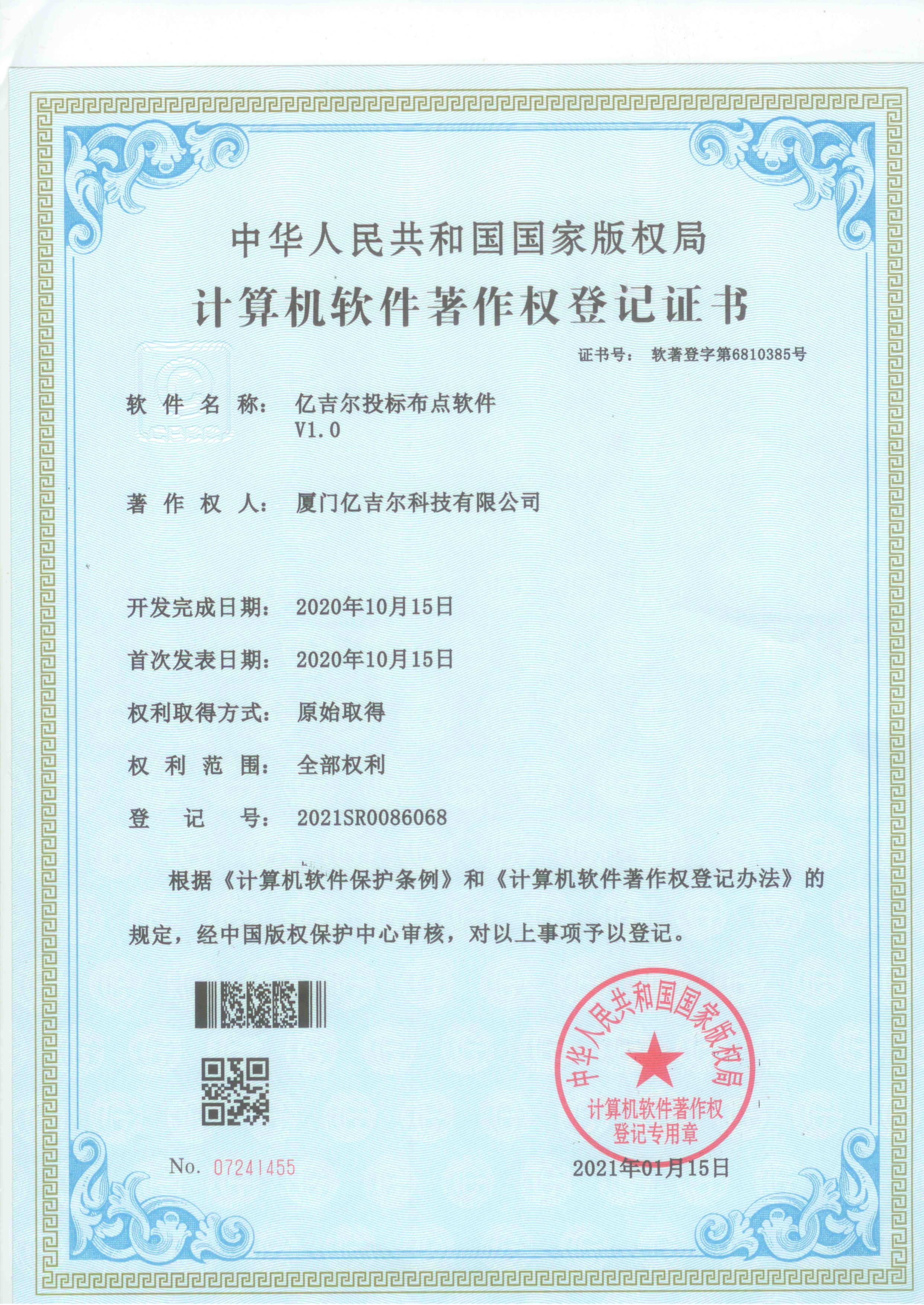 億吉爾投標(biāo)布點(diǎn)軟件著作權(quán)證書 發(fā)布日期:2023年11月22日 瀏覽次數(shù):1739 關(guān)鍵字: 公司 1/1億吉爾投標(biāo)布點(diǎn)軟件著作權(quán)登記證書