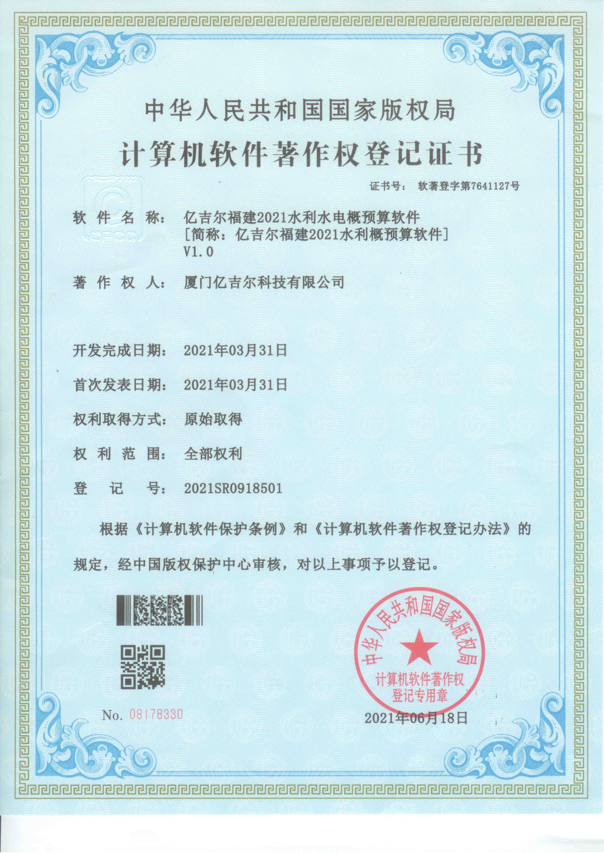 億吉爾福建2021水利水電概預(yù)算軟件著作權(quán)證書 發(fā)布日期:2023年11月22日 瀏覽次數(shù):1744 關(guān)鍵字: 公司 1/1億吉爾福建2021水利水電概預(yù)算軟件著作權(quán)證書