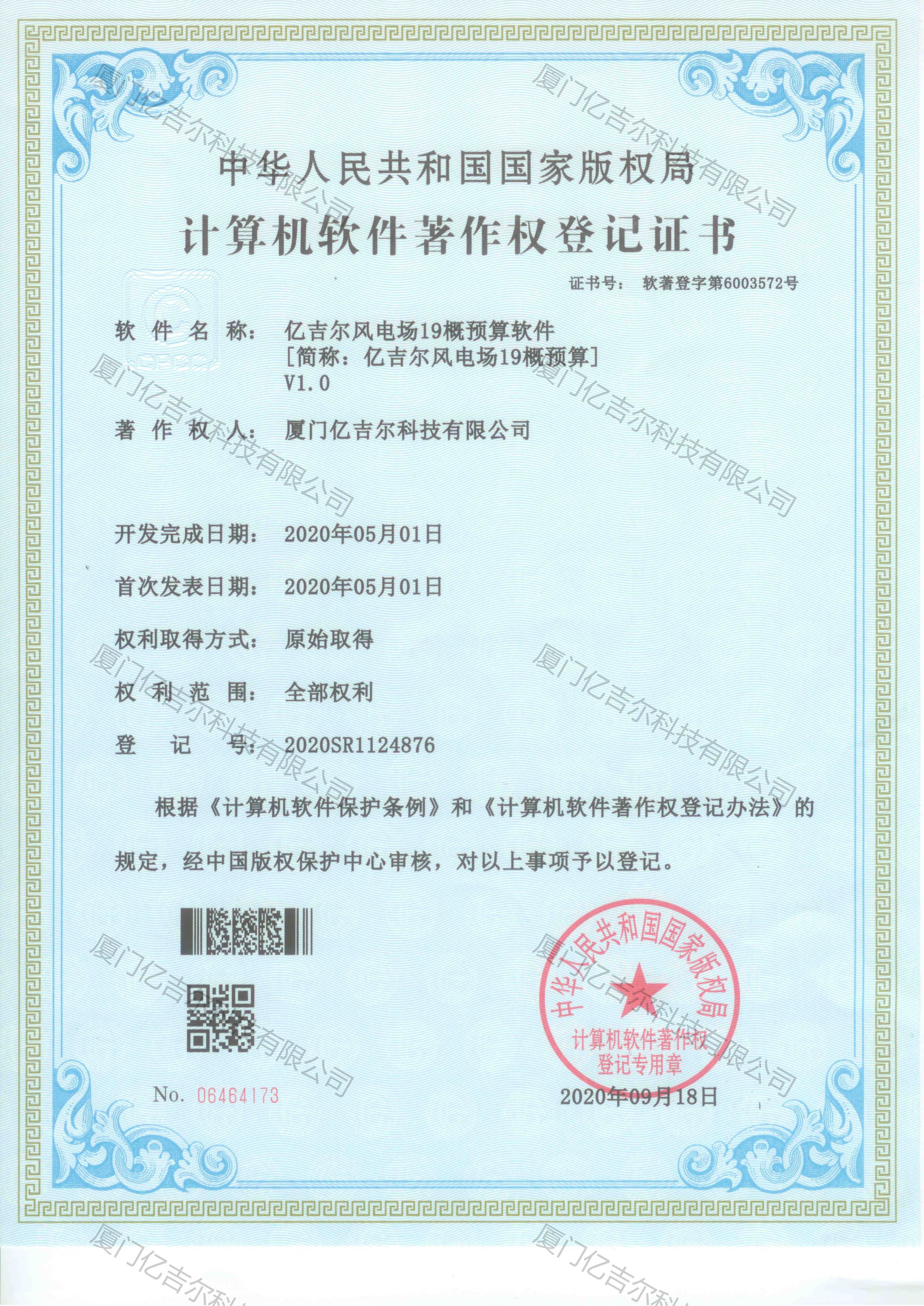 億吉爾風電場19概預算軟件著作權(quán)登記證書 發(fā)布日期:2020年09月18日 瀏覽次數(shù):3548 關(guān)鍵字: 公司 1/1億吉爾風電場19概預算軟件著作權(quán)登記證書