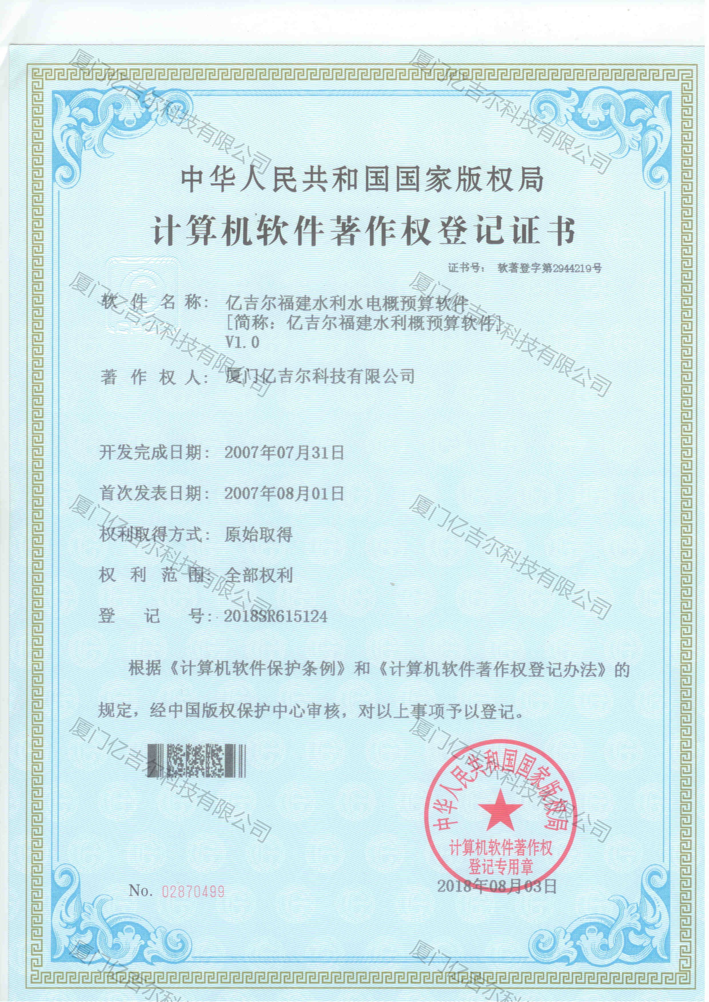 億吉爾福建水利水電概預(yù)算軟件著作權(quán)登記證書 發(fā)布日期:2018年08月03日 瀏覽次數(shù):3290 關(guān)鍵字: 公司 1/1億吉爾福建水利水電概預(yù)算軟件著作權(quán)登記證書