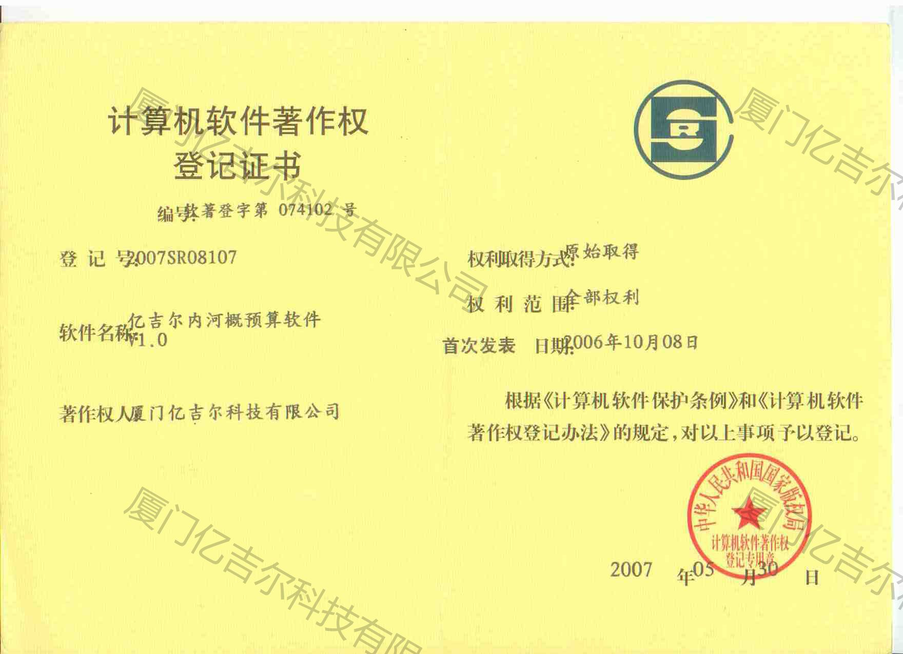 億吉爾內(nèi)河概預算軟件著作權(quán)登記證書 發(fā)布日期:2007年05月30日 瀏覽次數(shù):3123 關(guān)鍵字: 公司 1/1億吉爾內(nèi)河概預算軟件著作權(quán)登記證書