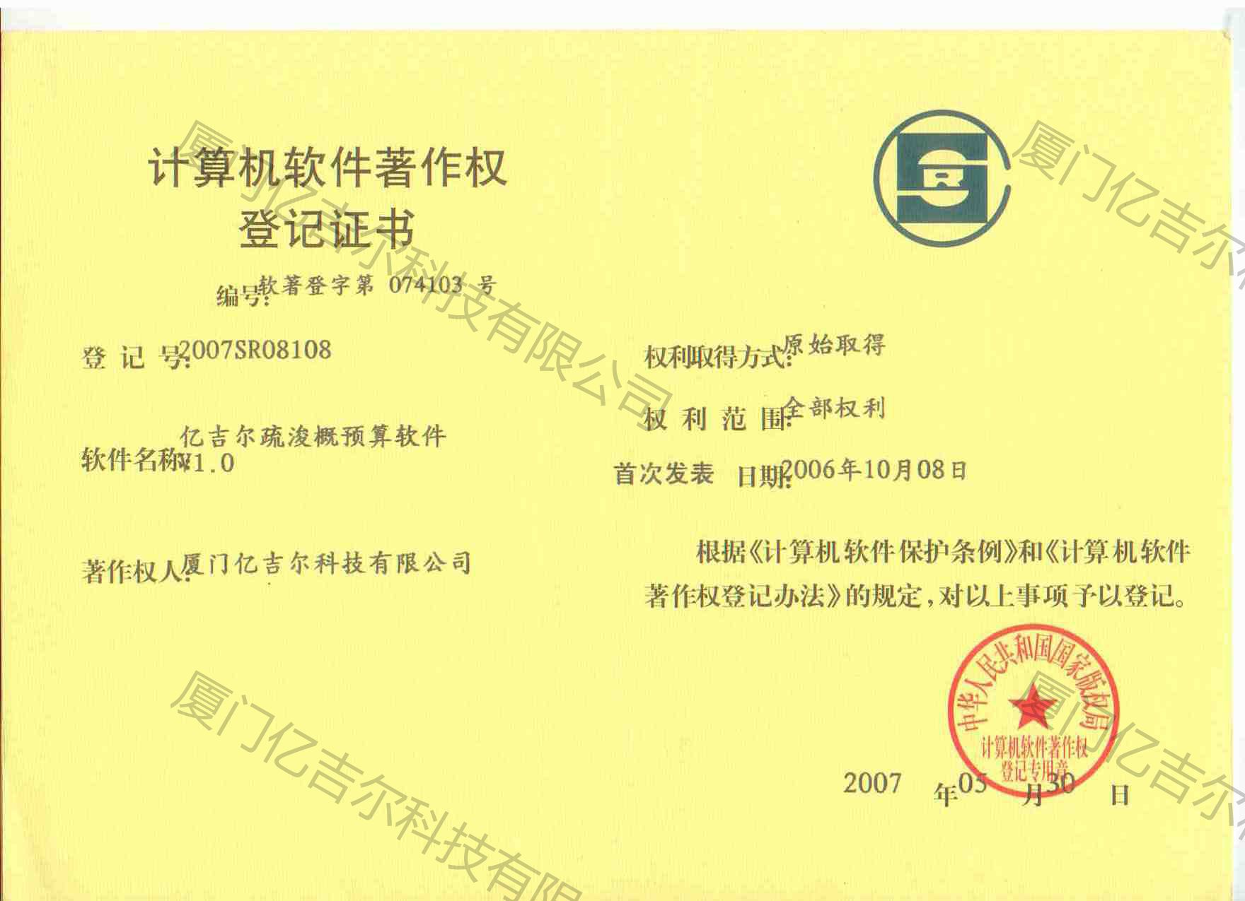 億吉爾疏浚概預(yù)算軟件著作權(quán)登記證書 發(fā)布日期:2007年05月30日 瀏覽次數(shù):3211 關(guān)鍵字: 公司 1/1億吉爾疏浚概預(yù)算軟件著作權(quán)登記證書