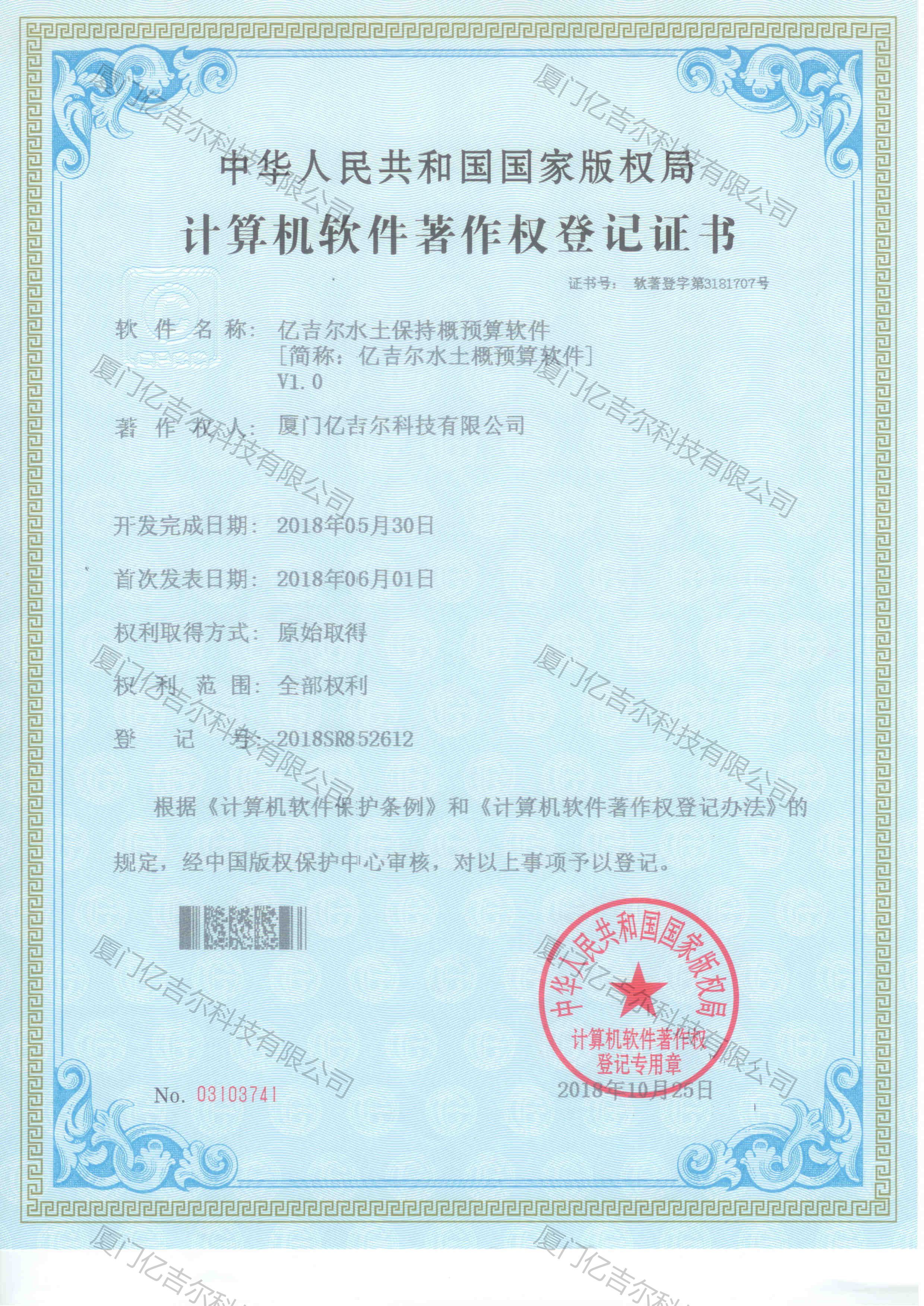 億吉爾水土保持概預(yù)算軟件著作權(quán)登記證書(shū) 發(fā)布日期:2018年10月25日 瀏覽次數(shù):3498 關(guān)鍵字: 公司 1/1億吉爾水土保持概預(yù)算軟件著作權(quán)登記證書(shū)
