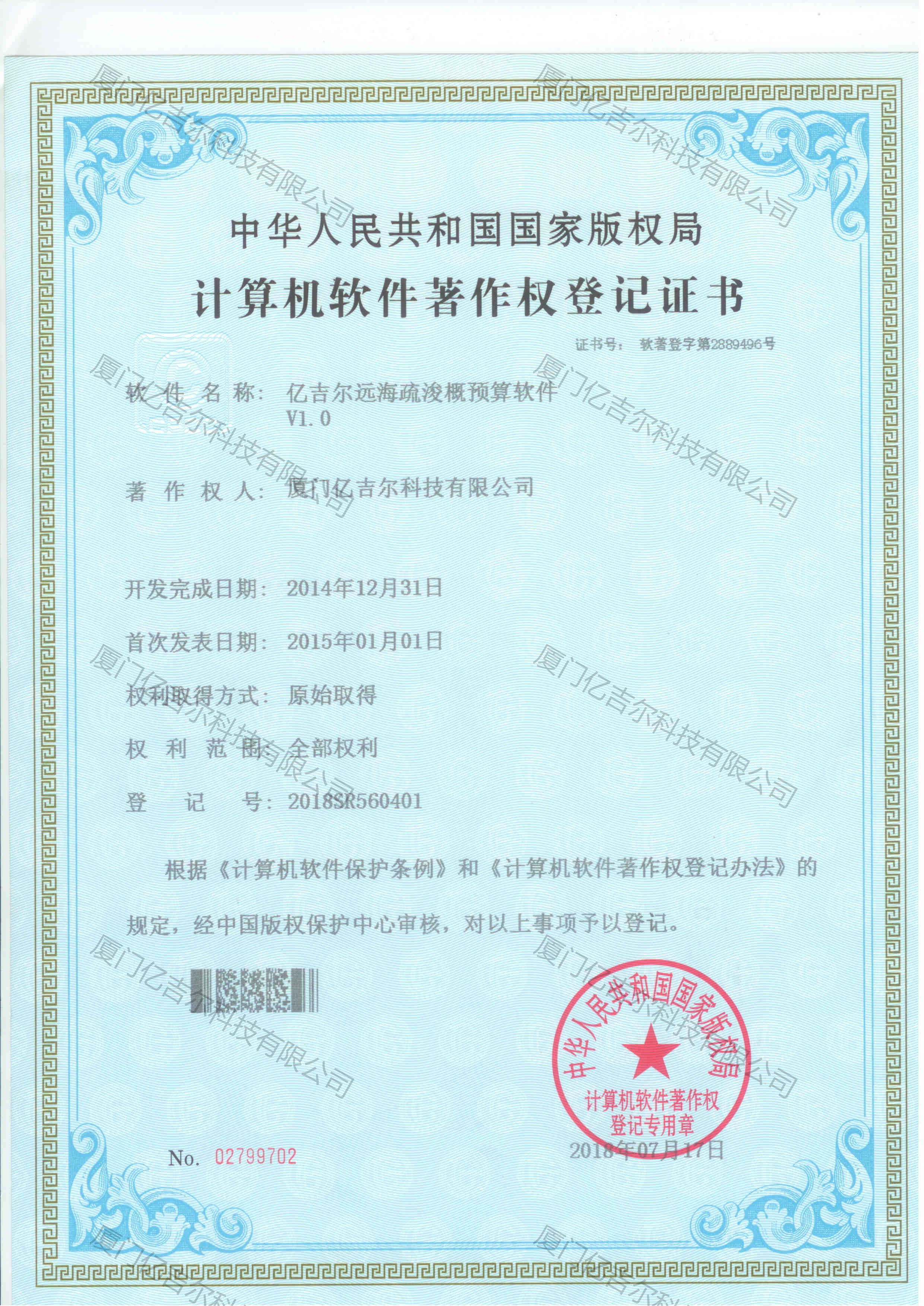 億吉爾遠海疏浚概預(yù)算軟件著作權(quán)登記證書 發(fā)布日期:2018年07月17日 瀏覽次數(shù):3251 關(guān)鍵字: 公司 1/1億吉爾遠海疏浚概預(yù)算軟件著作權(quán)登記證書